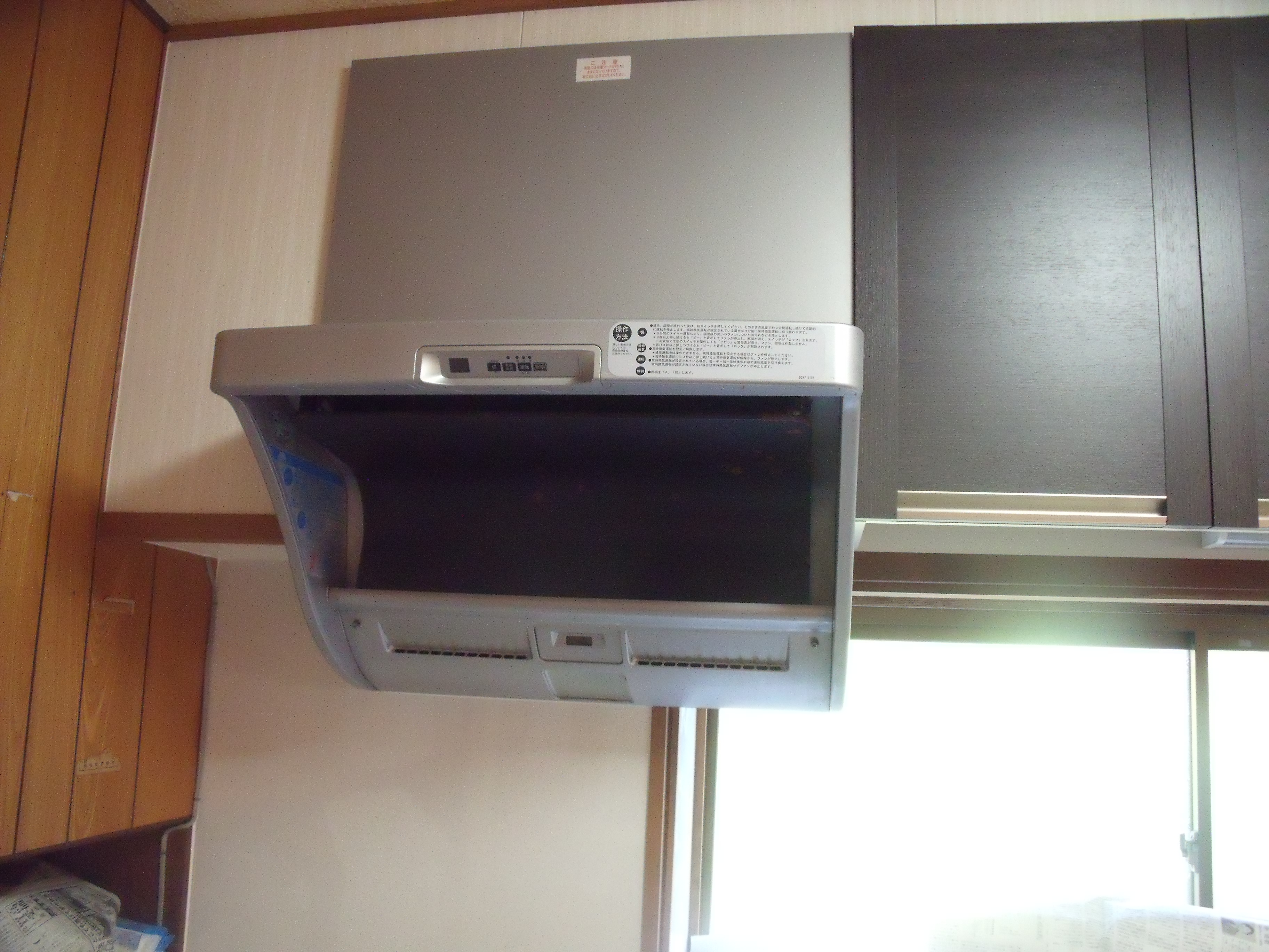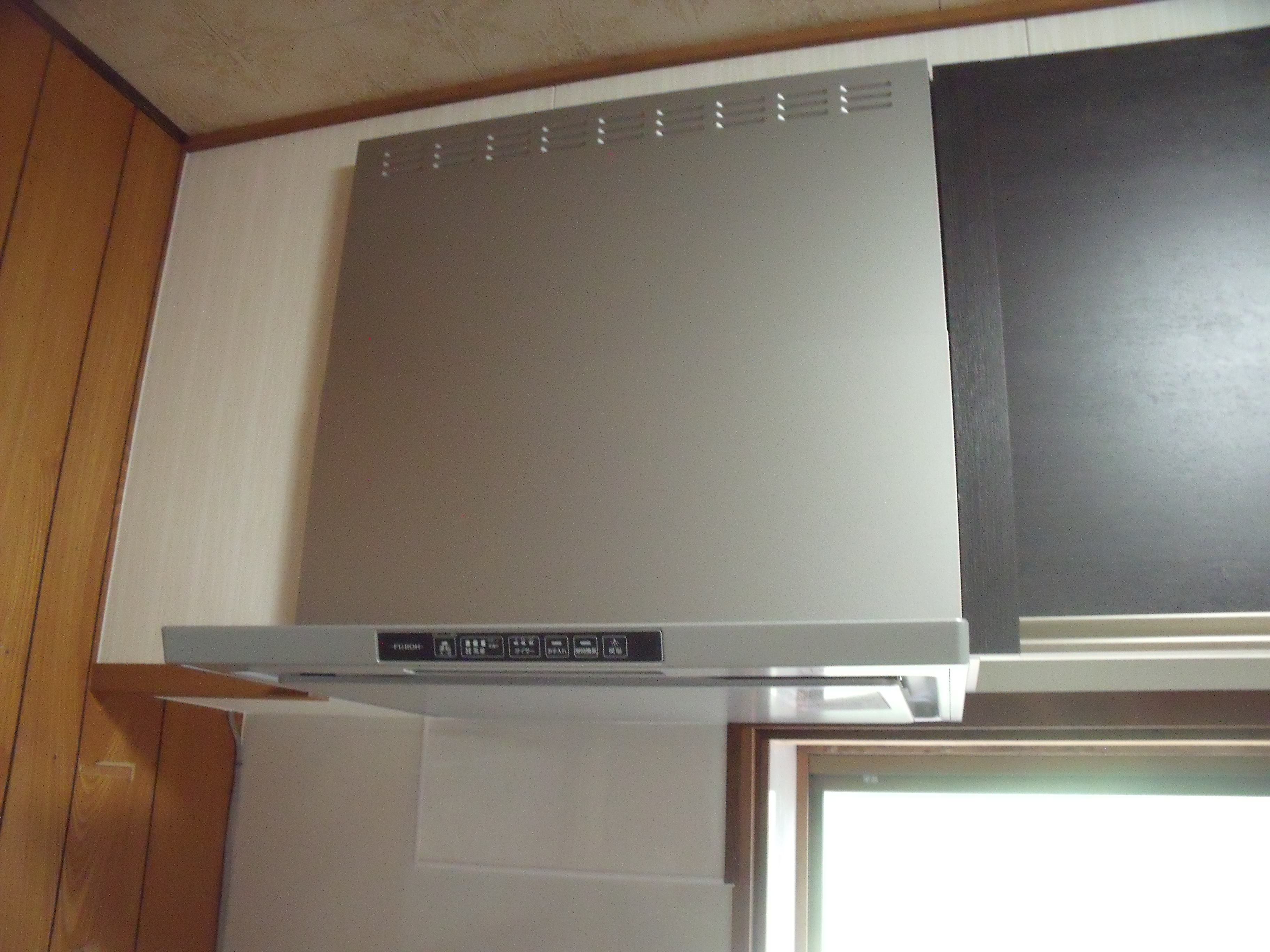 現在主流のスリム型レンジフード(整流板を設置して同等の性能で安価)へ取り替えます。キッチンパネルの補修も併せて行いました。